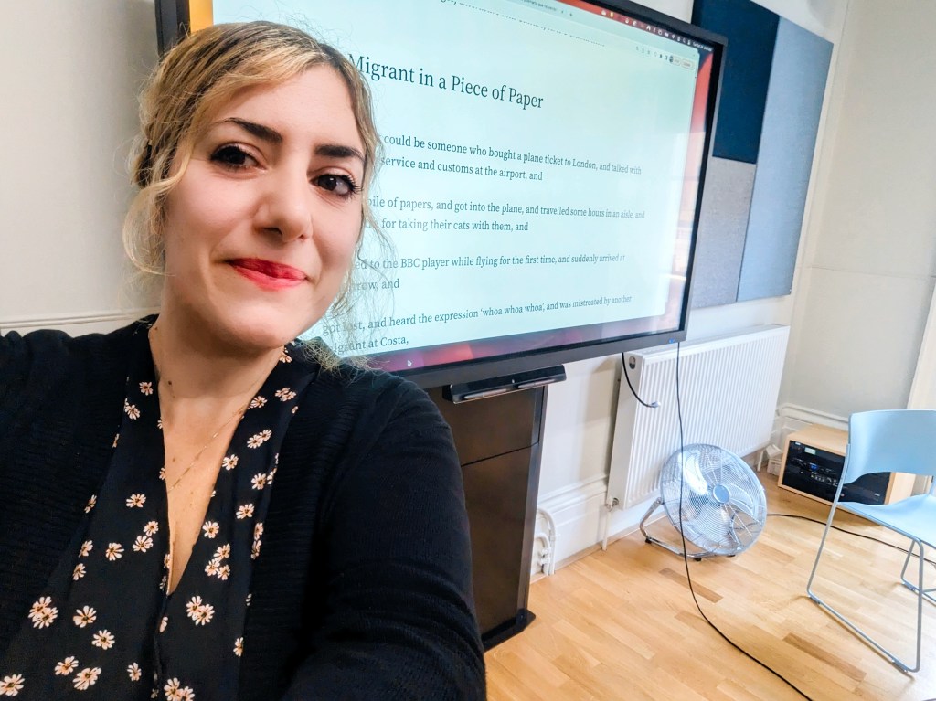 Many thanks to Joe Videan & Ben Armerding for inviting me to talk with these lovely students from California about my poem ‘A Migrant in a Piece of Paper’ (KCL/Wild Court). I had a wonderful time and I really enjoyed your students poems and questions. I hope to come back in the near future!